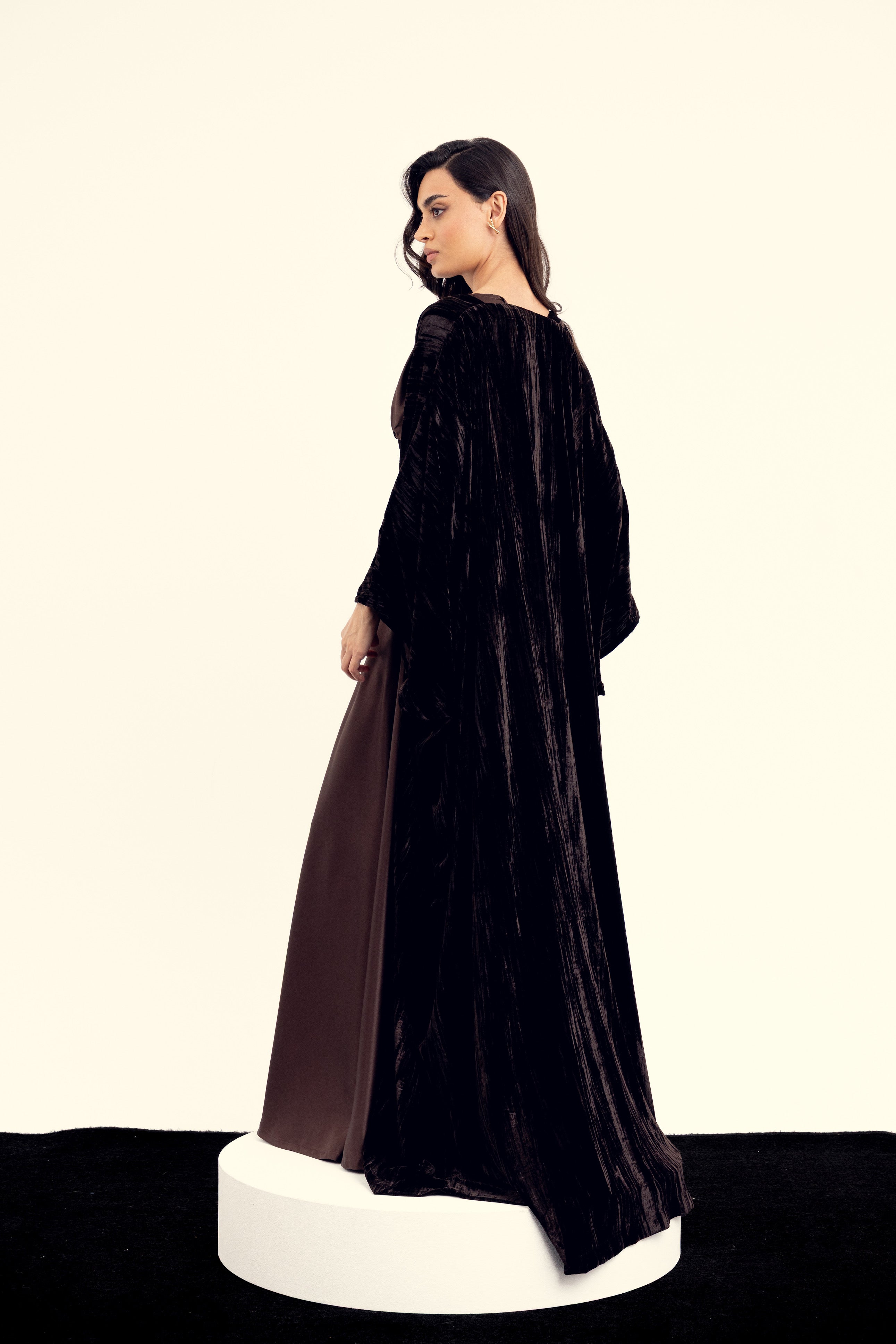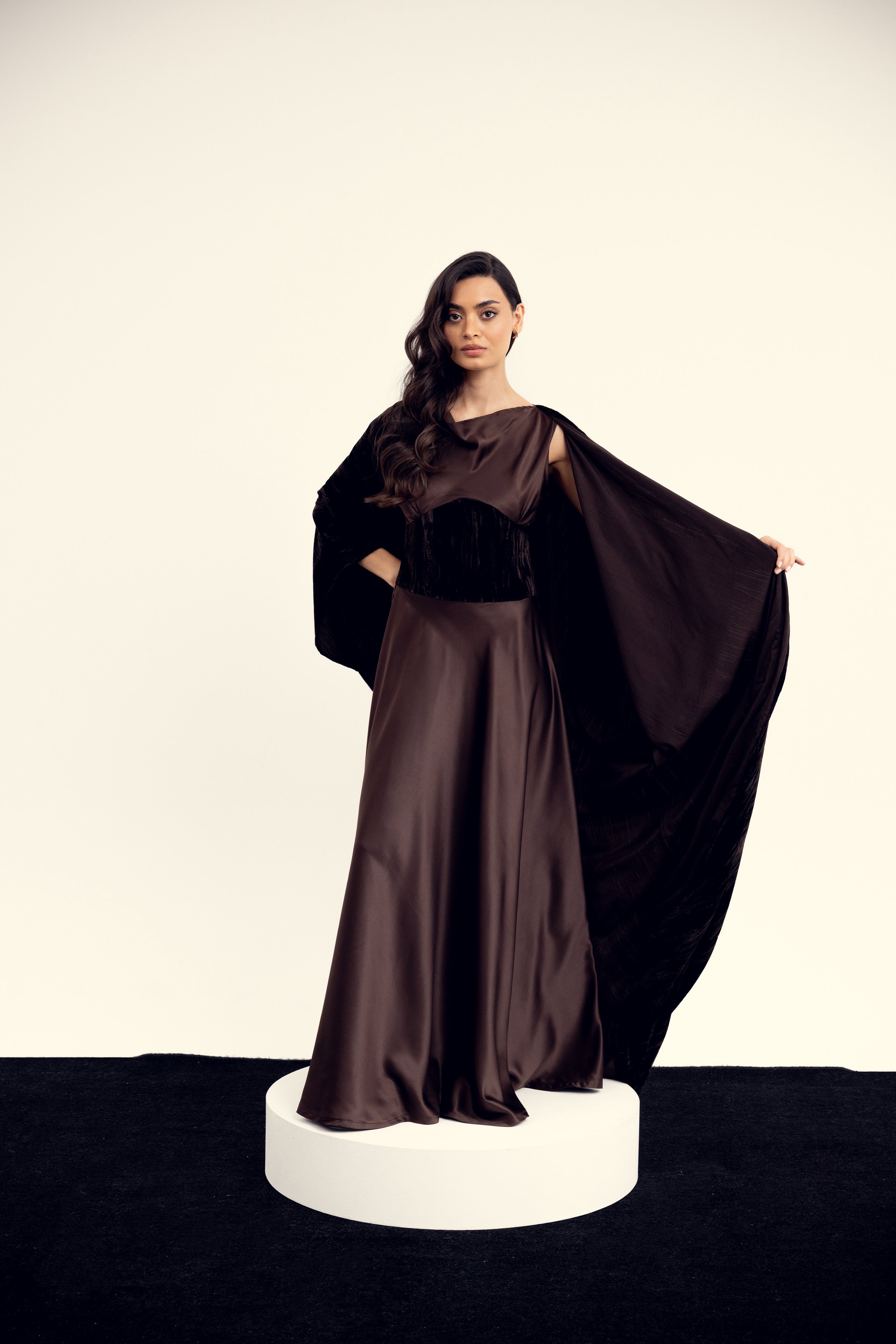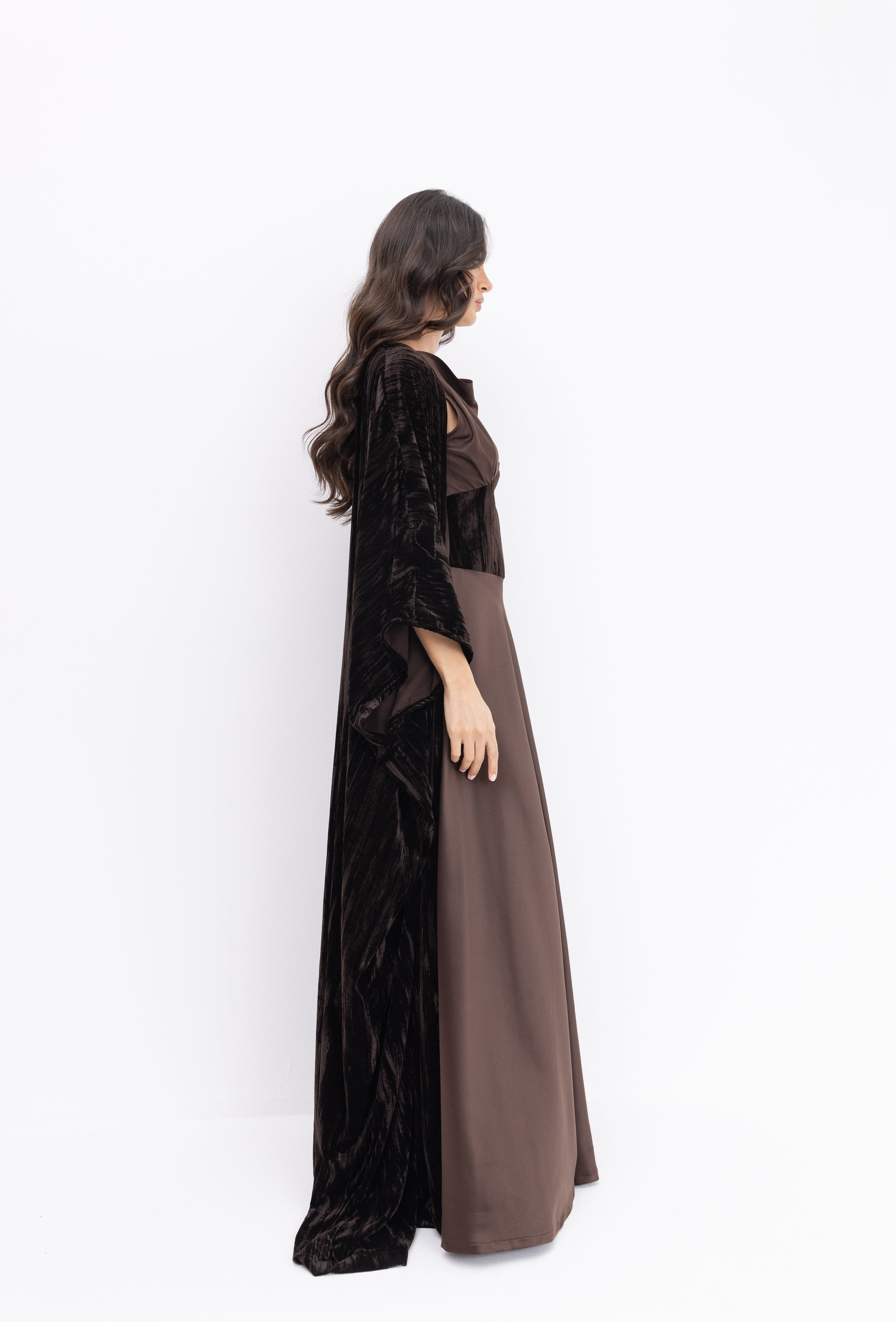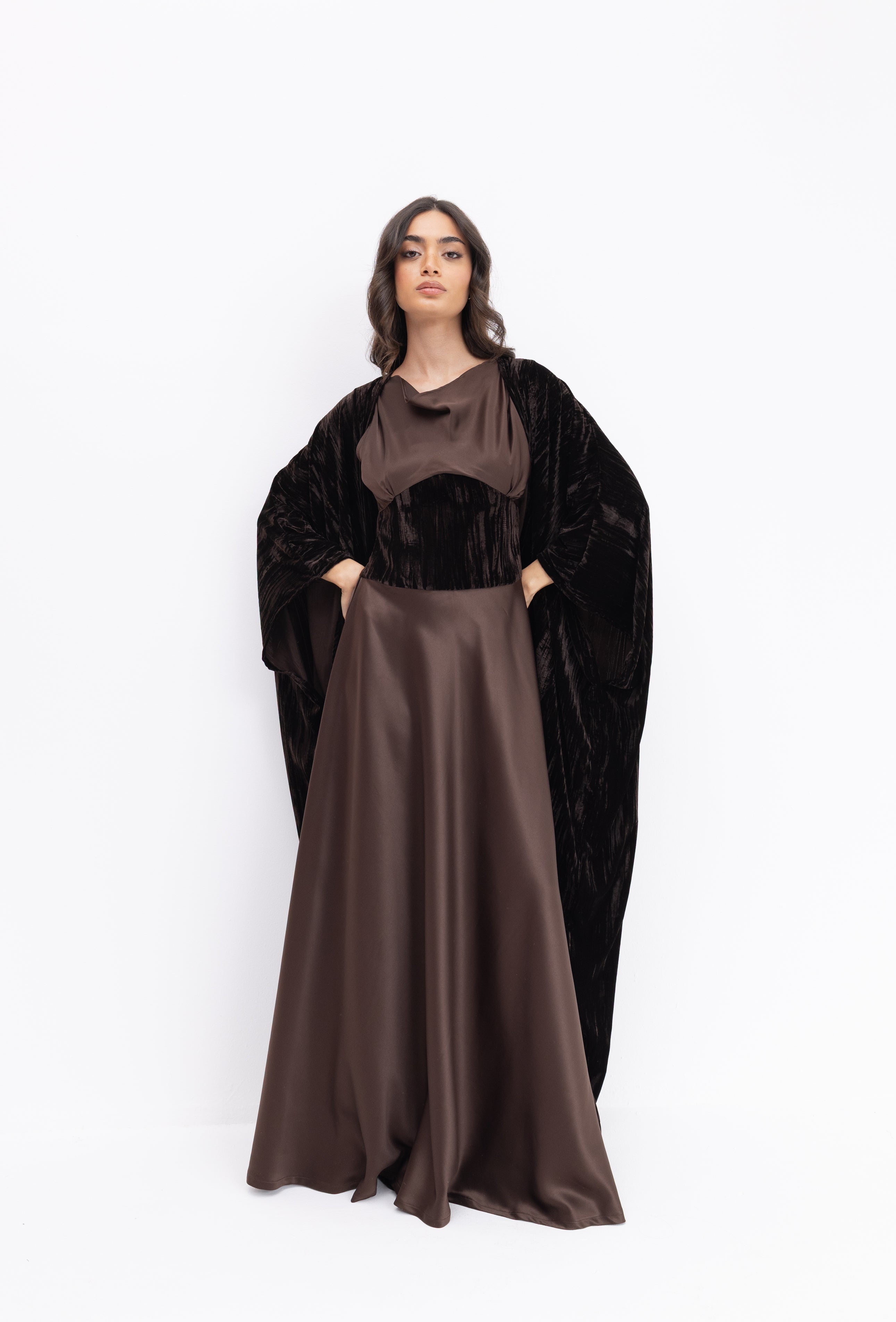A sculpted silk dress designed with a soft draped bodice and an integrated velvet waist detail that adds depth and contrast. Paired with a matching velvet bisht, Liora brings together smooth elegance and rich texture in a refined, cohesive silhouette.