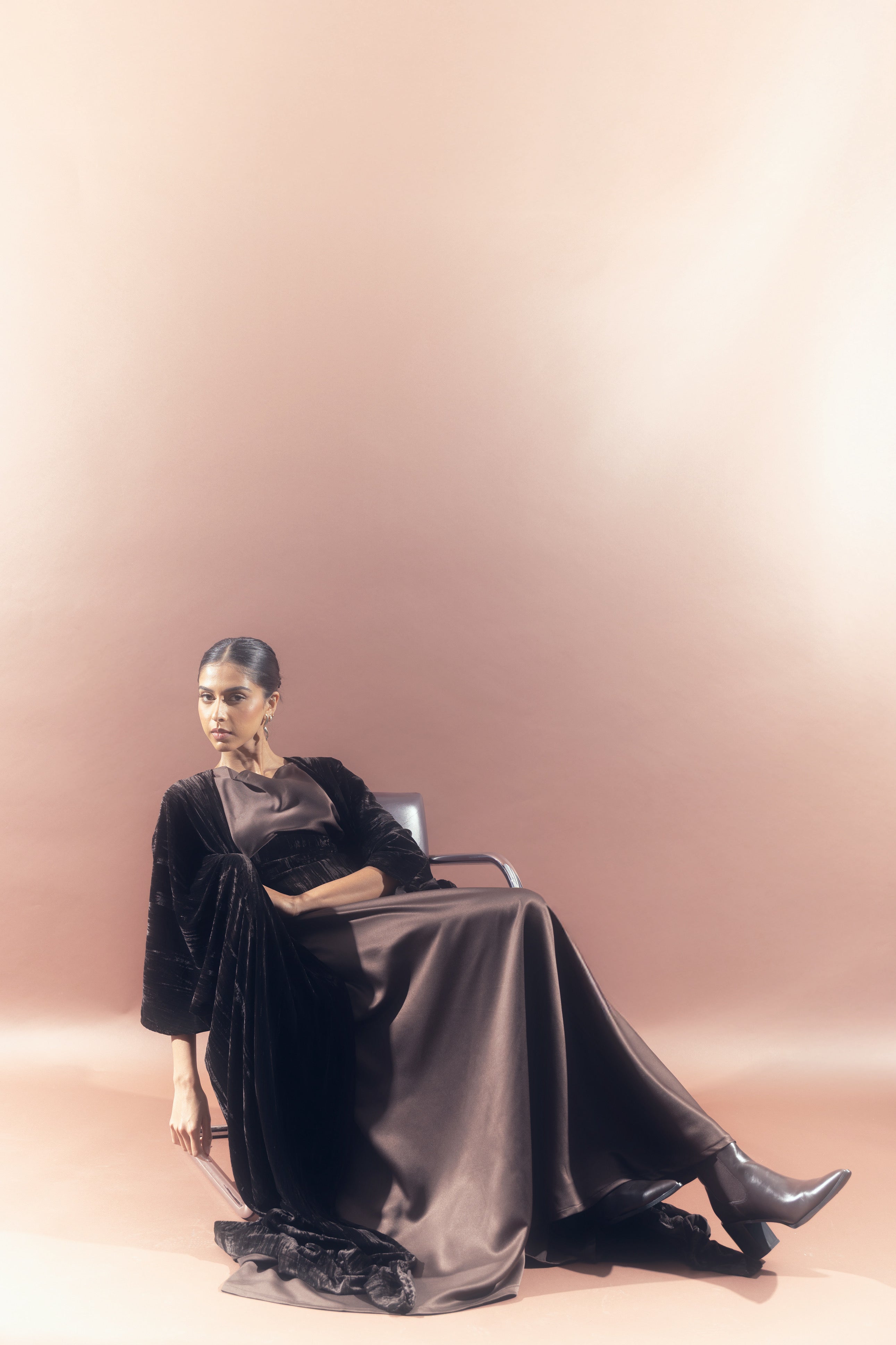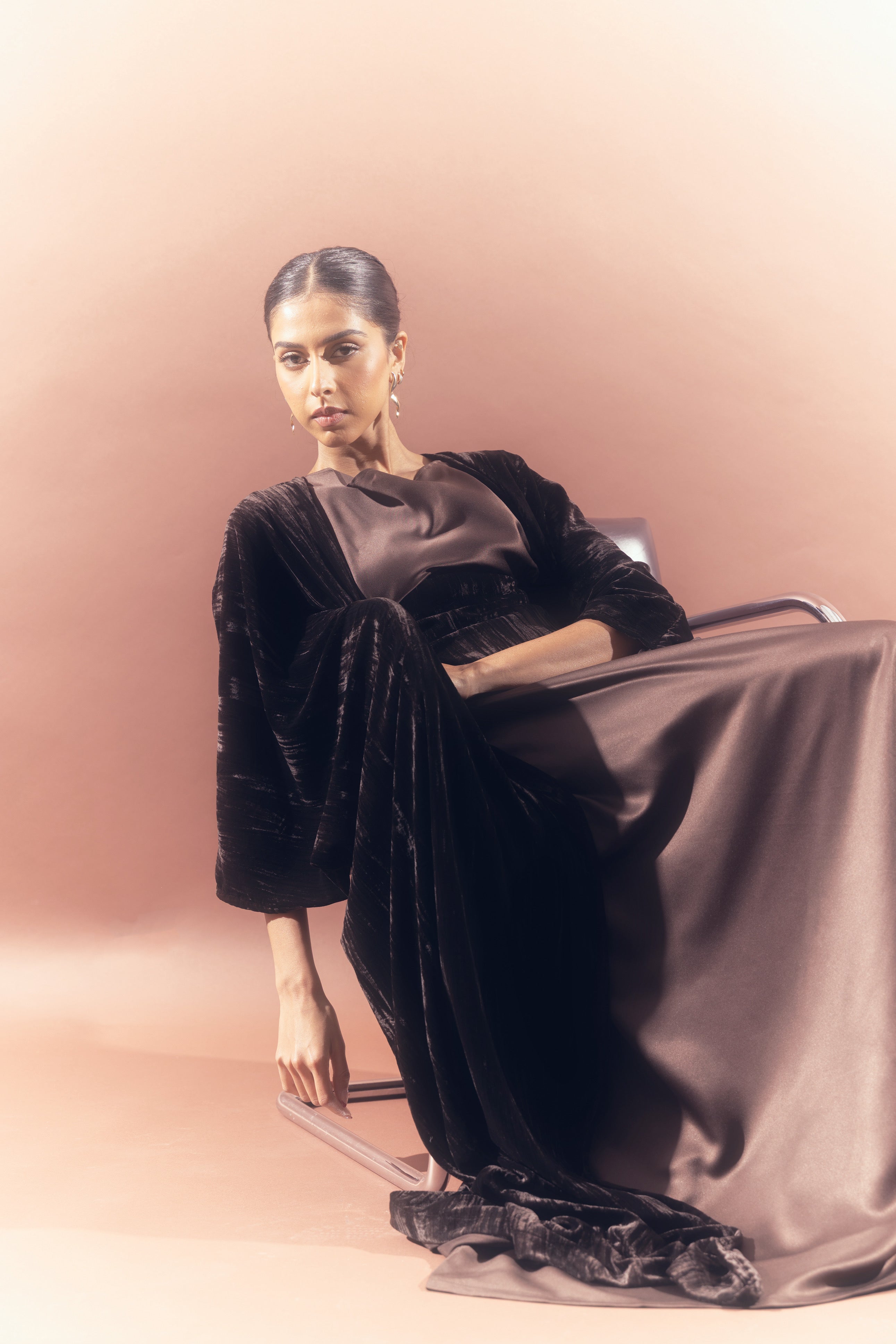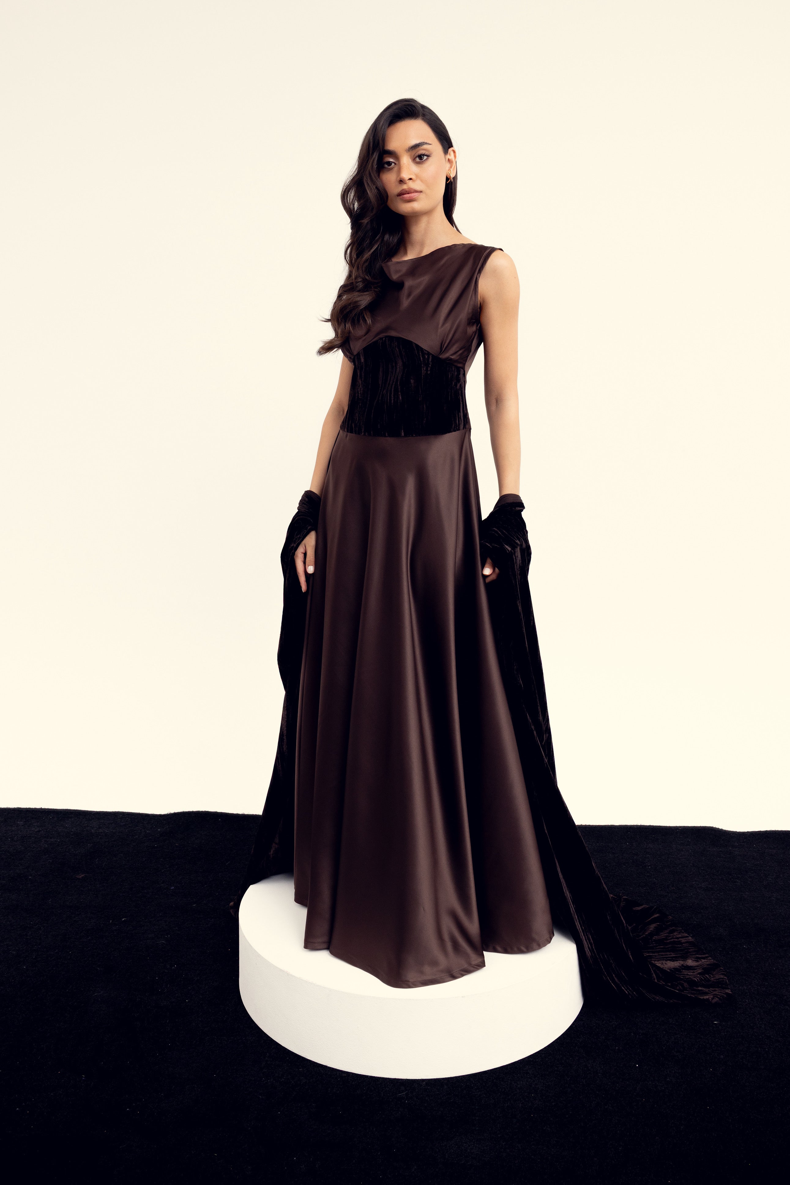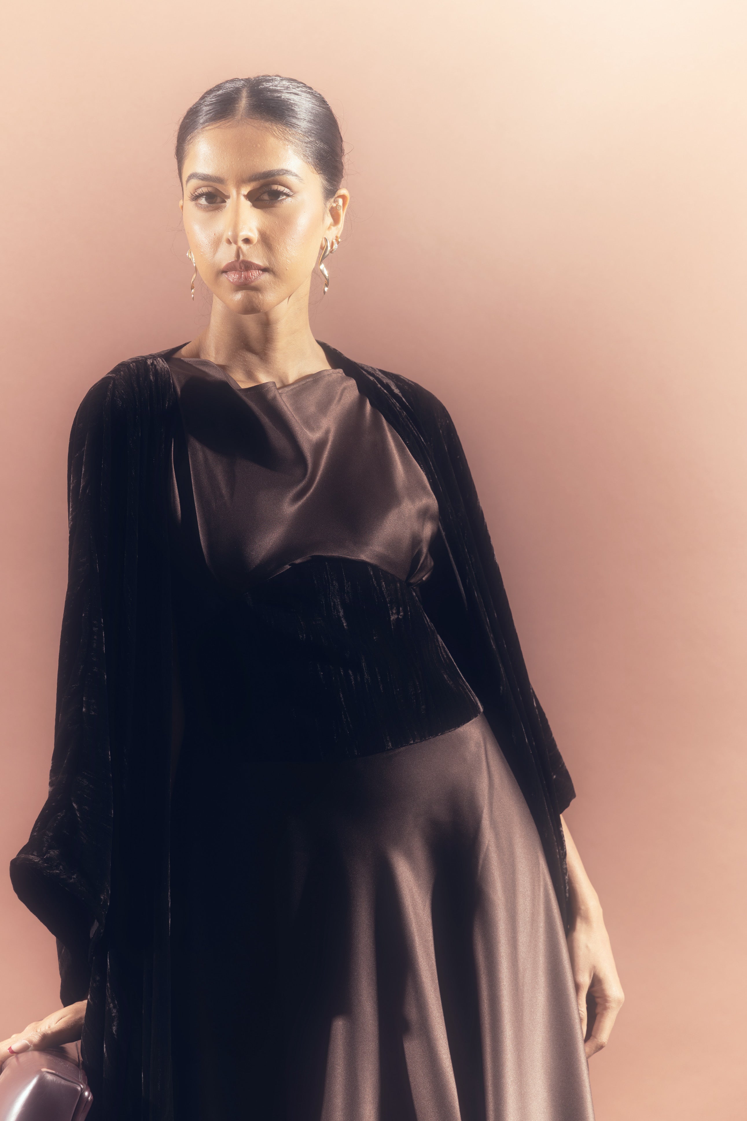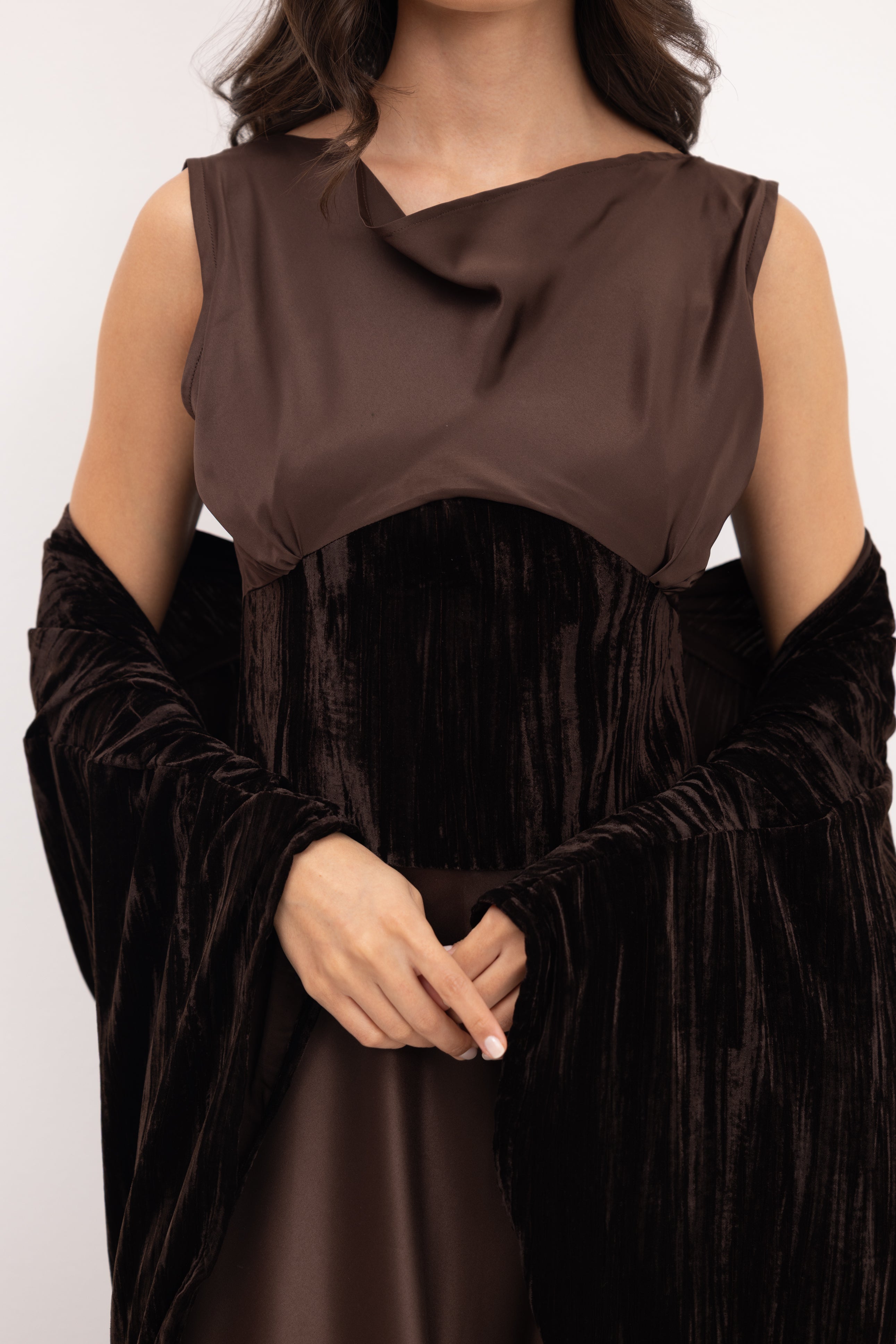 A sculpted silk dress designed with a soft draped bodice and an integrated velvet waist detail that adds depth and contrast. Paired with a matching velvet bisht, Liora brings together smooth elegance and rich texture in a refined, cohesive silhouette.